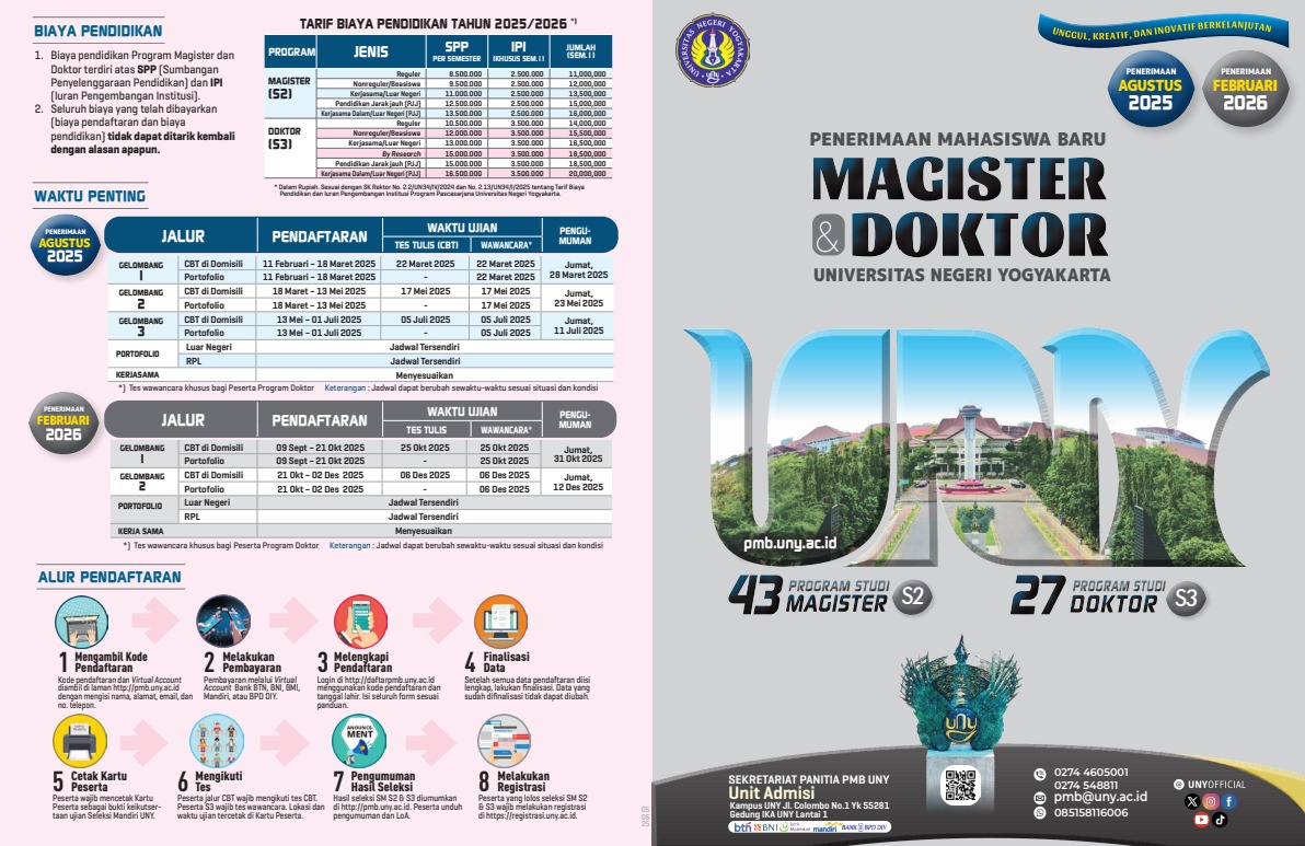 Informasi penerimaan mahasiswa baru Magister dan Doktor Universitas Negeri Yogyakarta, Universitas Negeri Yogyakarta (UNY) membuka penerimaan mahasiswa baru program Magister (S2) dan Doktor (S3)...
